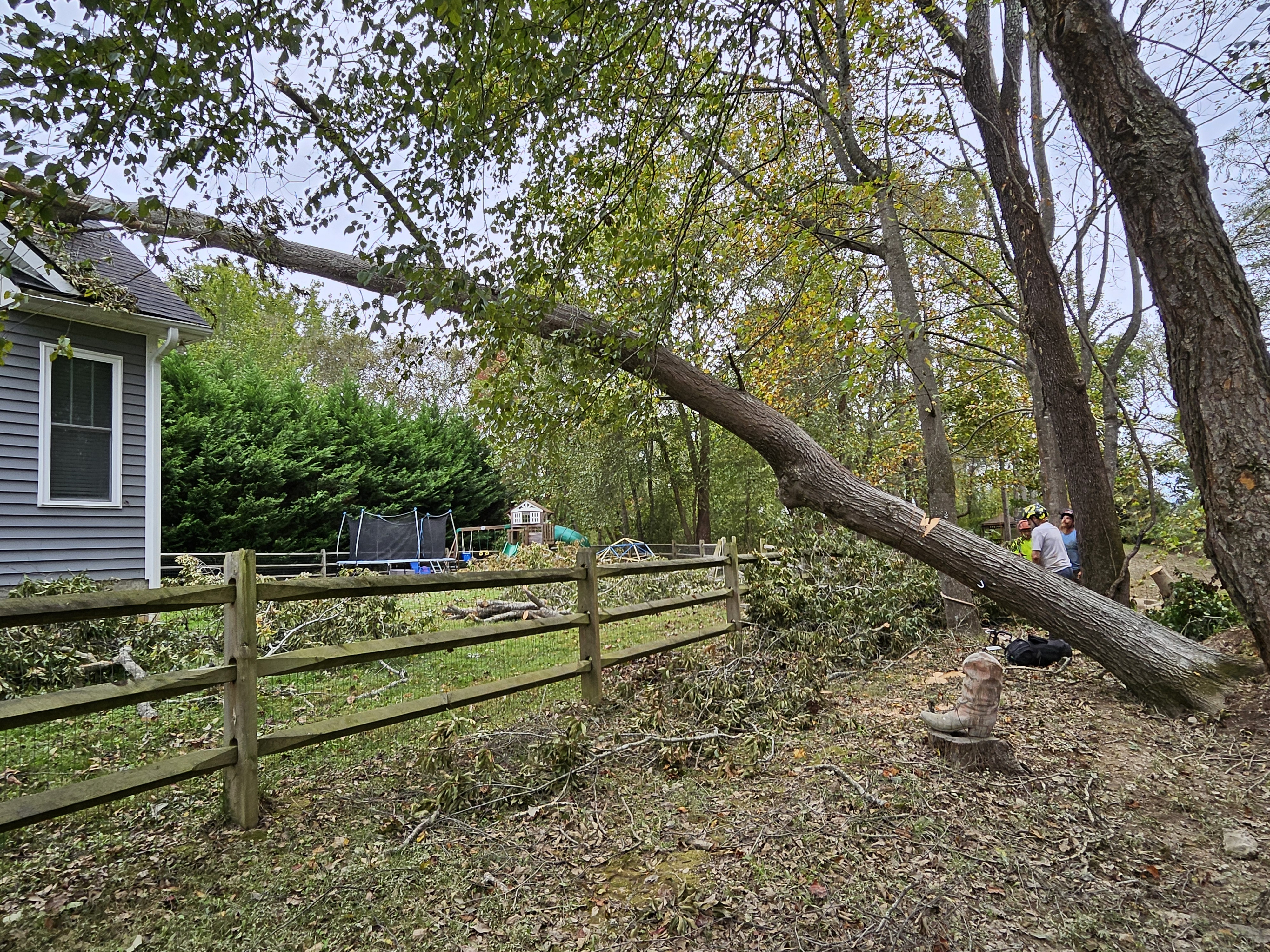 A large, hazardous tree had fallen on a house. Our crew safely removed the tree using rigging techniques to further minimize damage to the home.