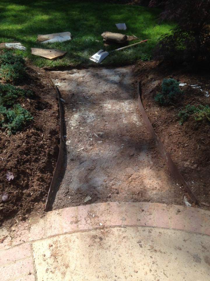 A custom flagstone walkway installation that includes excavation, gravel base preparation, and stone setting.